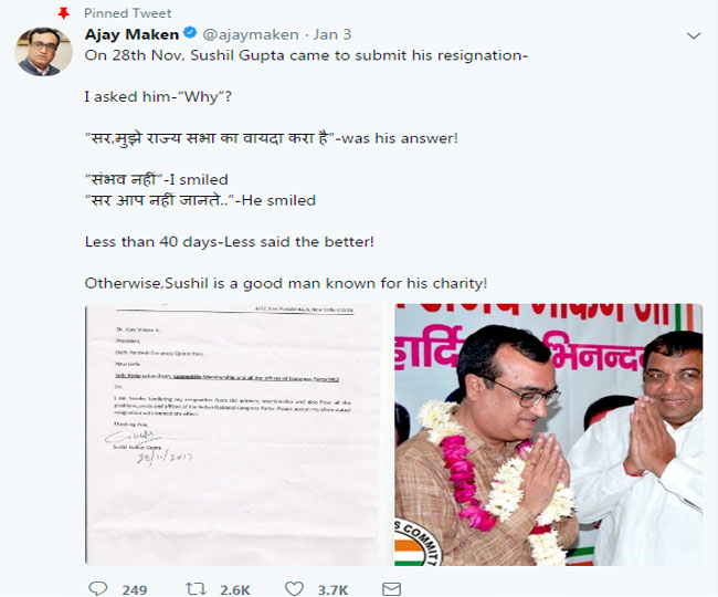 माकन ने ट्वीट कर कहा कि '28 नवंबर, 2017 को गुप्ता मेरे पास अपना इस्तीफा लेकर आए, जब मैंने उनसे पूछा कि क्यों, तो उन्होंने कहा कि मुझे राज्यसभा भेजने क ...और पढ़ें