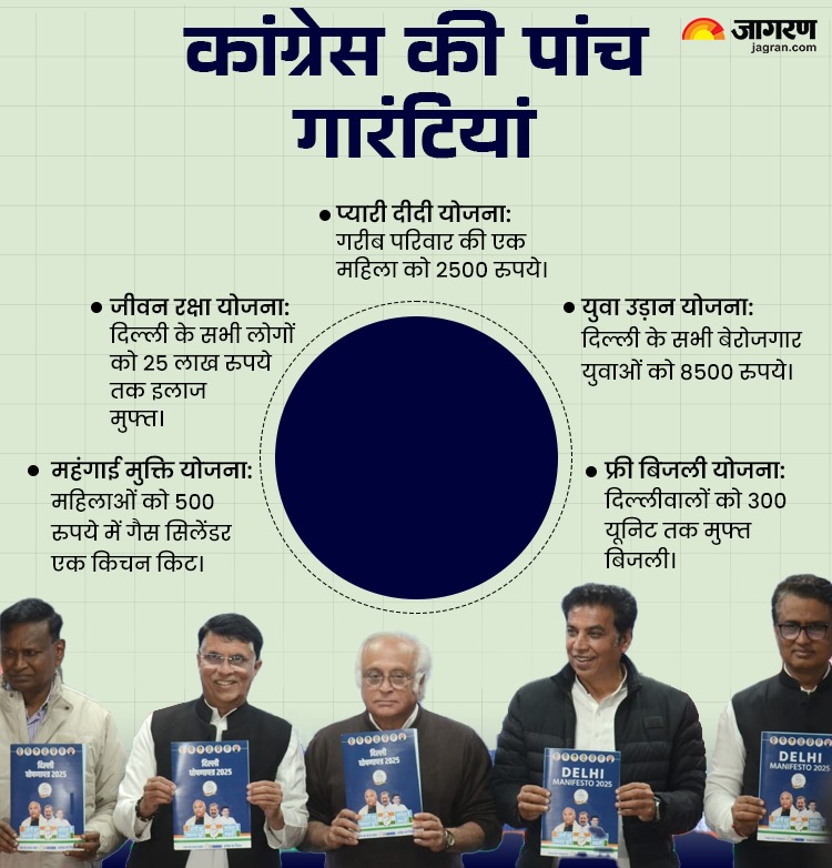 जागरण संवाददाता, नई दिल्ली। Congress released manifesto: दिल्ली विधानसभा चुनाव (Delhi Vidhan Sabha Chunav 2025) के लिए कांग्रेस ने बुधवार को अपना घोषणापत्र जारी कर दिया। कांग्रेस पार्टी ने घोषणा पत्र को लेकर पत्रकार वार्ता की। जिसमें जयराम रमेश ने कहा कि कर्नाटक के चुनाव में कांग्रेस पार्टी ने गारंटी शब्द का इस्तेमाल किया।