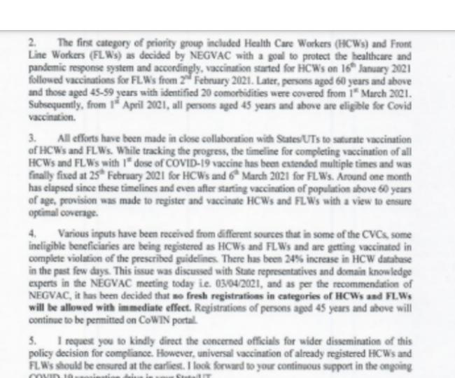 सरकार की ओर से जो गाइड लाइंस तय की गई थी उनका पालन नहीं किया गया। इस वजह से अब ये तय किया गया है कि फ्रंट लाइन वर्कर्स और हेल्थ केयर वर्कर्स के नाम पर किसी भी नए व्यक्ति का रजिस्ट्रेशन नहीं किया जाएगा। कुछ लोगों ने हेल्थ केयर वर्कर्स और फ्रंट लाइन वर्कर्स के नाम पर काफी अयोग्य लोगों को भी वैक्सीन लगा दी गई।
