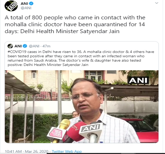 सतेंद्र जैन ने बताया कि मोहल्ला क्लीनिक डॉक्टर के पास महिला आयी थी। इसकी वजह डॉक्टर व चार अन्य लोग कोरोना पॉजिटिव पाए गए हैं। इनमें डॉक्टर की पत्नी और उनकी बेटी भी कोरोना संक्रमित पायी गई है।