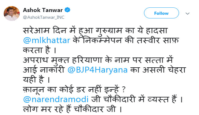 वहीं, इस पर राजनीति पर शुरू हो गई है। हरियाणा प्रदेश कांग्रेस कमेटी (HPCC) के अध्यक्ष अशोक तंवर ने ट्वीट करके केंद्र में सत्तासीन नरेंद्र मोदी सरकार पर तंज कसा है। कांग्रेस नेता अशोक तंवर ने अपने ट्वीटर हैंडल पर लिखा है- 'सरेआम दिन में हुआ गुरुग्राम का ये हादसा @mlkhattar के निकम्मेपन की तस्वीर साफ़ करता है। अपराध मुक्त हरियाणा के नाम पर सत्ता में आई नाकारी @BJP4Haryana का असली चेहरा यही है। क़ानून का कोई डर नहीं इन्हें? @narendramodi जी चौकीदारी में व्यस्त हैं । लोग मर रहे हैं चौकीदार जी।'