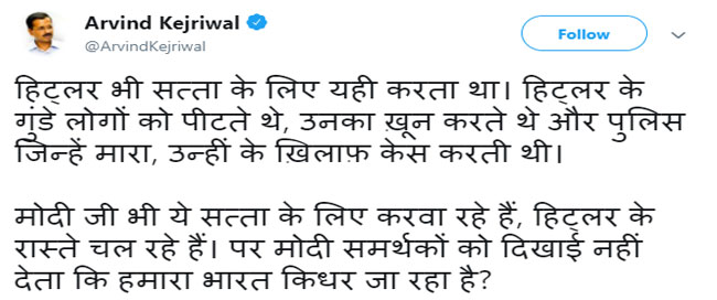वहीं, दिल्ली के सीएम अरविंद केजीरवाल ने ट्वीट कर पीएम मोदी को निशाने पर लिया है- 'हिट्लर भी सत्ता के लिए यही करता था। हिट्लर के गुंडे लोगों को पीटते थे, उनका ख़ून करते थे और पुलिस जिन्हें मारा, उन्हीं के ख़िलाफ़ केस करती थी। मोदी जी भी ये सत्ता के लिए करवा रहे हैं, हिट्लर के रास्ते चल रहे हैं। पर मोदी समर्थकों को दिखाई नहीं देता कि हमारा भारत किधर जा रहा है?'