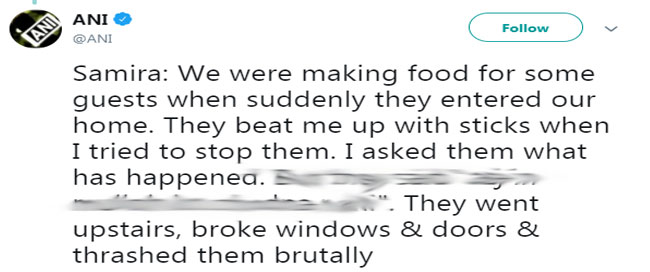 पीड़िता समीरा ने समाचार एजेंसी एएनआइ से बताया-'घर में मेहमानों के लिए खाना बनाया जा रहा था। इसी दौरार अचानक ही कुछ लोग घर के अंदर घुस आए और लोगों को मारना पीटना शुरू दिया।