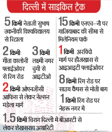 एक सर्वे के मुताबिक अकेले दिल्ली में 11 लाख साइकिलें हैं लेकिन, पिछले 30 साल में साइकिल ट्रिप 21 से घटकर पांच प्रतिशत रह गए हैं। मास्टर प्लान 2021 के मुताबिक 24 मीटर या इससे ज्यादा चौड़ी सड़क पर साइकिल ट्रैक होना चाहिए। इस हिसाब से तीन हजार किमी मास्टर प्लान सड़कों पर पांच हजार किमी लोकल सड़कें हैं। यूनिफाइड ट्रैफिक एंड ट्रांसपोर्टेशन इन्फ्रास्ट्रक्चर (प्लानिंग एंड इंजीनियरिंग) सेंटर यानी यूटीपैक द्वारा स्ट्रीट डिजाइन नियमों में साइकिल ट्रैक की पूरी जानकारी भी दी गई है, बावजूद इसके बमुश्किल 40 किमी साइकिल ट्रैक बने हैं।
