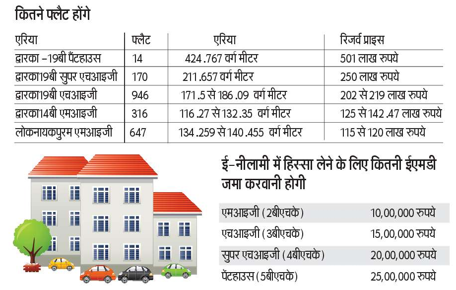 इसमें शामिल दो हजार से अधिक फ्लैटों को ई-नीलामी के जरिये बेचा जाएगा। योजना में द्वारका सेक्टर-19 बी के बने डीडीए कांप्लेक्स में 14 पेंटहाउस, 170 सुपर एचआइजी और 946 एचआइजी फ्लैट शामिल हैं।