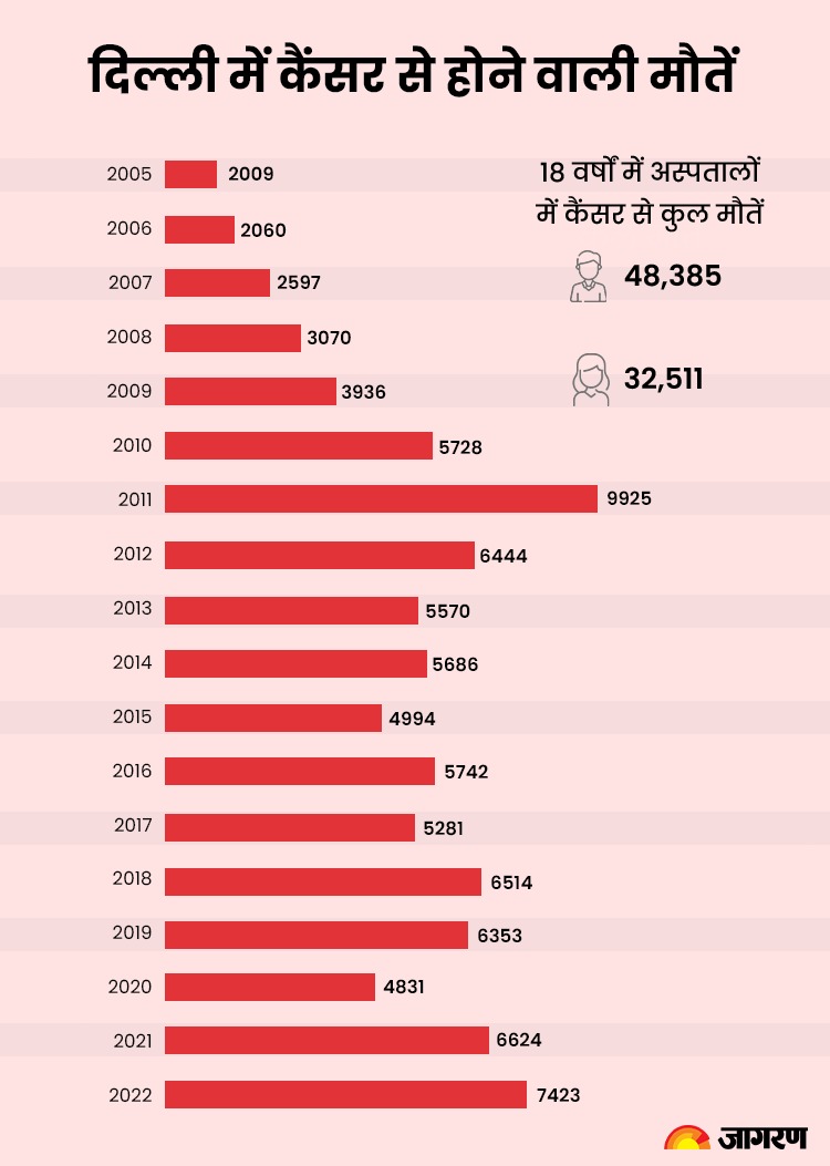 रणविजय सिंह, नई दिल्ली। कैंसर के मामले बढ़ने के साथ यह बड़ा जानलेवा साबित हो रहा है। दिल्ली में पिछले 18 वर्षों में कैंसर से होने वाली मौतें साढ़े तीन गुना तक बढ़ गई हैं। डॉक्टर इसका एक कारण प्रदूषण भी मानते हैं।