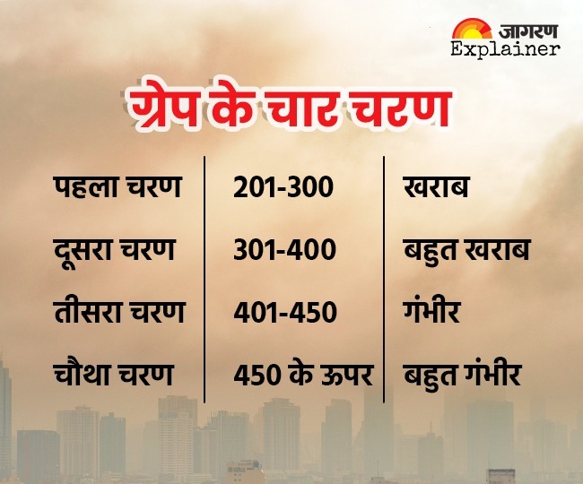 आईए जानते हैं कि ग्रेप एक्शन कितने चरणों के होते हैं और कितनी वायु गुणवत्ता पर कौन से श्रेणी के ग्रेप को लागू किया जाता है।
