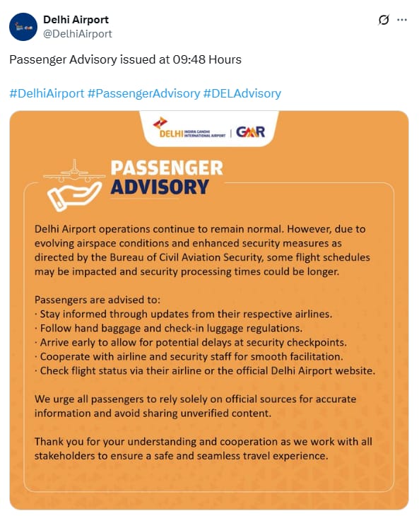 हवाई अड्डे की ओर से कहा गया कि फिलहाल दिल्ली हवाई अड्डे पर परिचालन सामान्य है। हालांकि, नागरिक उड्डयन सुरक्षा ब्यूरो के आदेशों के अनुसार, हवाई क्षेत्र की बदलती परिस्थितियों और बढ़े हुए सुरक्षा उपायों के कारण, कुछ उड़ान कार्यक्रम प्रभावित हो सकते हैं और सुरक्षा जांच बिंदु प्रसंस्करण समय लंबा हो सकता है।