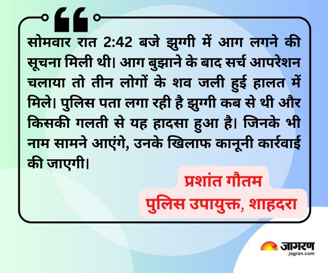 मैं आइजीएल कंपनी के लिए खोदाई का काम करता हूं। अभी शास्त्री नगर में काम चल रहा है। सोमवार रात को कर्मचारी नितिन ने फोन करके बताया कि झुग्गी में आग लगी गई है। मैं मौके पर पहुंचा तो पता चला तीन कर्मचारी नहीं मिल रहे हैं, दमकल ने आग बुझाने के बाद सर्च आपरेशन चलाया तो उनके शव झुग्गी के अंदर से बरामद हुए। झुग्गी मेरी नहीं थी। -दिलीप, ठेकेदार