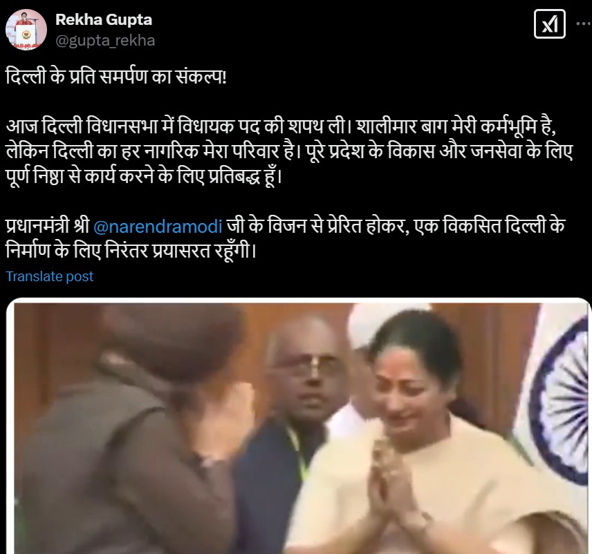 - दिल्ली की मुख्मंत्री रेखा गुप्ता (Rekha Gupta) ने शपथ लेने के बाद अपने सोशल मीडिया एक्स पर पोस्ट करते हुए लिखा कि दिल्ली के प्रति समर्पण का संकल्प! आज दिल्ली विधानसभा में विधायक पद की शपथ ली। शालीमार बाग मेरी कर्मभूमि है, लेकिन दिल्ली का हर नागरिक मेरा परिवार है। पूरे प्रदेश के विकास और जनसेवा के लिए पूर्ण निष्ठा से कार्य करने के लिए प्रतिबद्ध हूँ। पीएम नरेंद्र मोदी जी के विजन से प्रेरित होकर, एक विकसित दिल्ली के निर्माण के लिए निरंतर प्रयासरत रहूँगी।