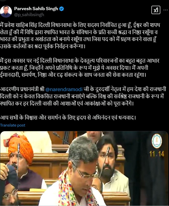 मैं इस अवसर पर नई दिल्ली विधानसभा के देवतुल्य परिवारजनों का बहुत बहुत आभार प्रकट करता हूँ, जिन्होंने अपने प्रतिनिधि के रूप में मुझे ये अवसर दिया। मैं अपनी ईमानदारी, समर्पण, निष्ठा और दृढ़ संकल्प के साथ जनता की सेवा करता रहूंगा। प्रवेश साहिब सिंह ने पीएम मोदी को टैग करते हुए लिखा कि आदरणीय प्रधानमंत्री श्री नरेंद्र मोदी जी के दूरदर्शी नेतृत्व में हम देश की राजधानी दिल्ली को न केवल विकसित राजधानी बनाएंगे बल्कि विश्व की सर्वश्रेष्ठ राजधानी के रूप में स्थापित कर हर दिल्ली वासी की आशाओं एवं आकांक्षाओं को पूरा करेंगे। आप सभी के विश्वास और समर्थन के लिए हृदय से अभिनंदन एवं धन्यवाद।