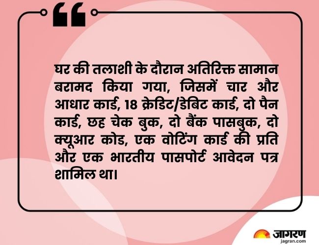 वहीं, घर की तलाशी के दौरान अतिरिक्त सामान बरामद किया गया, जिसमें चार और आधार कार्ड, 18 क्रेडिट/डेबिट कार्ड, दो पैन कार्ड, छह चेक बुक, दो बैंक पासबुक, दो क्यूआर कोड, एक वोटिंग कार्ड की प्रति और एक भारतीय पासपोर्ट आवेदन पत्र शामिल था। उसने एक अन्य आरोपित अमीनुर इस्लाम तक पहुंचाया।
