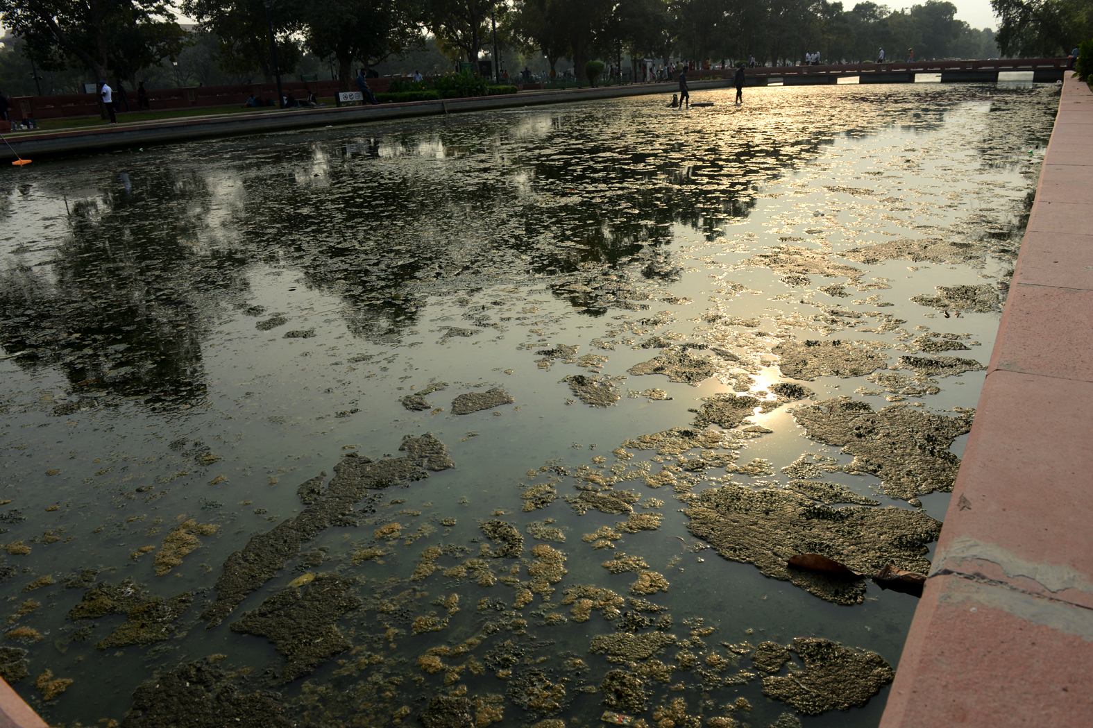 कर्तव्य पथ पर बंद पड़ा फव्वारा व तालाब में फैली गंदगी।