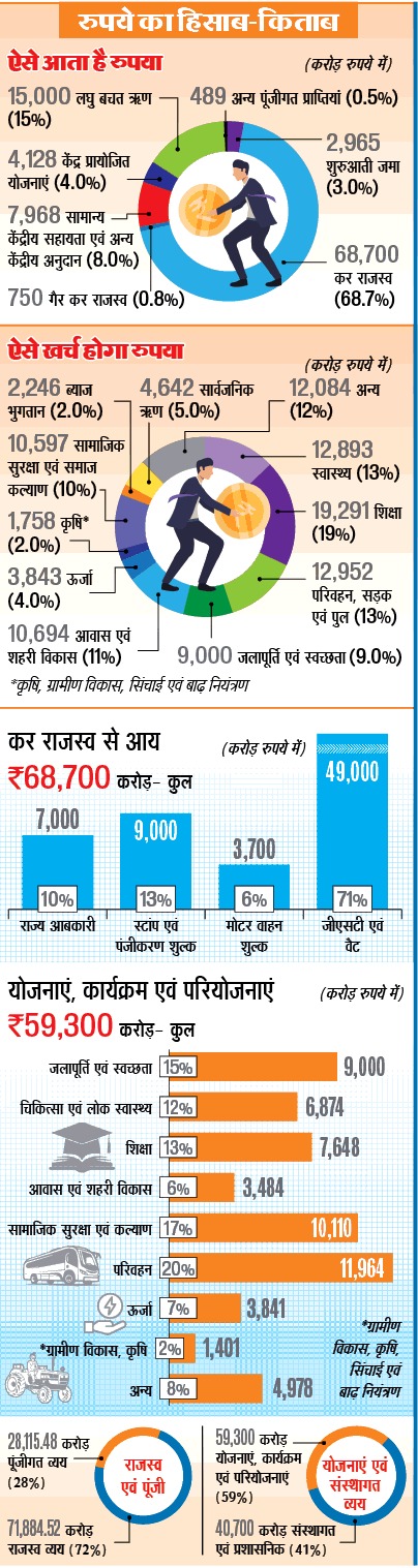 जागरण संवाददाता, नई दिल्ली। दिल्ली के प्रति प्रधानमंत्री नरेंद्र मोदी की सोच से प्रेरित मुख्यमंत्री रेखा गुप्ता ने मंगलवार को वित्त वर्ष 2025-26 के लिए एक लाख करोड़ रुपये का बजट प्रस्तुत किया। यह पिछले वित्त वर्ष 2024-25 के बजट 76 हजार करोड़ रुपये की तुलना में 31.5 प्रतिशत अधिक है। आइए हम आपको इस रिपोर्ट में बताएंगे कि आखिर बजट की इस भारी भरकम रकम को कैसे खर्च किया जाएगा।