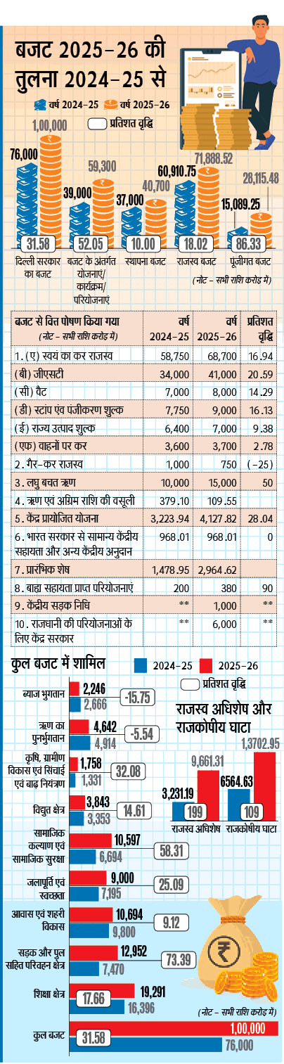 Delhi Budget 2025 दिल्ली सरकार ने 2025-26 के लिए एक लाख करोड़ का बजट पेश किया है। यह पिछले साल आप की सरकार में पेश किए गए बजट से 31.5 प्रतिशत ज्यादा है। साथ ही कुछ ऐसे तथ्य बताए गए हैं जिनसे आप सरकार के बजट से भाजपा सरकार के बजट में फर्क दिखाते हैं। आम आदमी पार्टी सरकार के कार्यकाल में पहली बार दिल्ली राजस्व घाटे में गई थी।