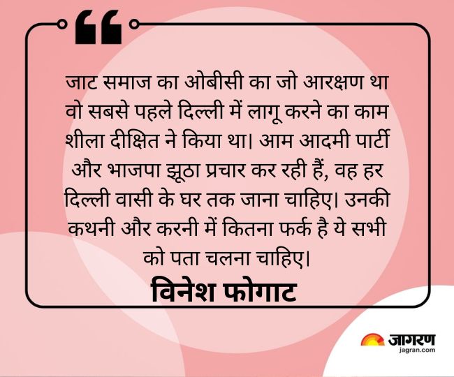 विनेश फोगाट ने कहा, "जाट समाज का ओबीसी का जो आरक्षण था वो सबसे पहले दिल्ली में लागू करने का काम शीला दीक्षित ने किया था। आम आदमी पार्टी और भाजपा झूठा प्रचार कर रही हैं, वह हर दिल्ली वासी के घर तक जाना चाहिए। उनकी कथनी और करनी में कितना फर्क है ये सभी को पता चलना चाहिए।"