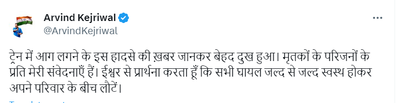 ट्रेन में आग लगने के इस हादसे की खबर जानकर बेहद दुख हुआ। मृतकों के परिजनों के प्रति मेरी संवेदनाएं हैं। ईश्वर से प्रार्थना करता हूं कि सभी घायल जल्द से जल्द स्वस्थ होकर अपने परिवार के बीच लौटें।