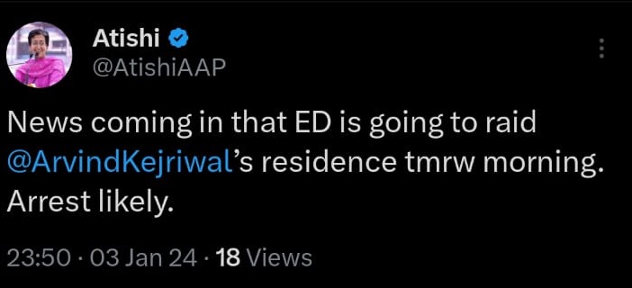 दिल्ली सरकार में कैबिनेट मंत्री और आप नेता आतिश ने सोशल साइट्स एक्स पर पोस्ट करते हुए लिखा, खबर आ रही है कि ईडी आज सुबह अरविंद केजरीवाल के आवास पर छापेमारी करने जा रही है और गिरफ्तारी की संभावना है।