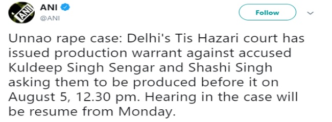 तीस हजारी कोर्ट ने सुनवाई के दौरान इस मामले में मुख्य आरोपित यूपी के विधायक कुलदीप सिंह सेंगर और दूसरे आरोपित शशि सिंह के खिलाफ प्रोडक्शन वारंट जारी किया है।