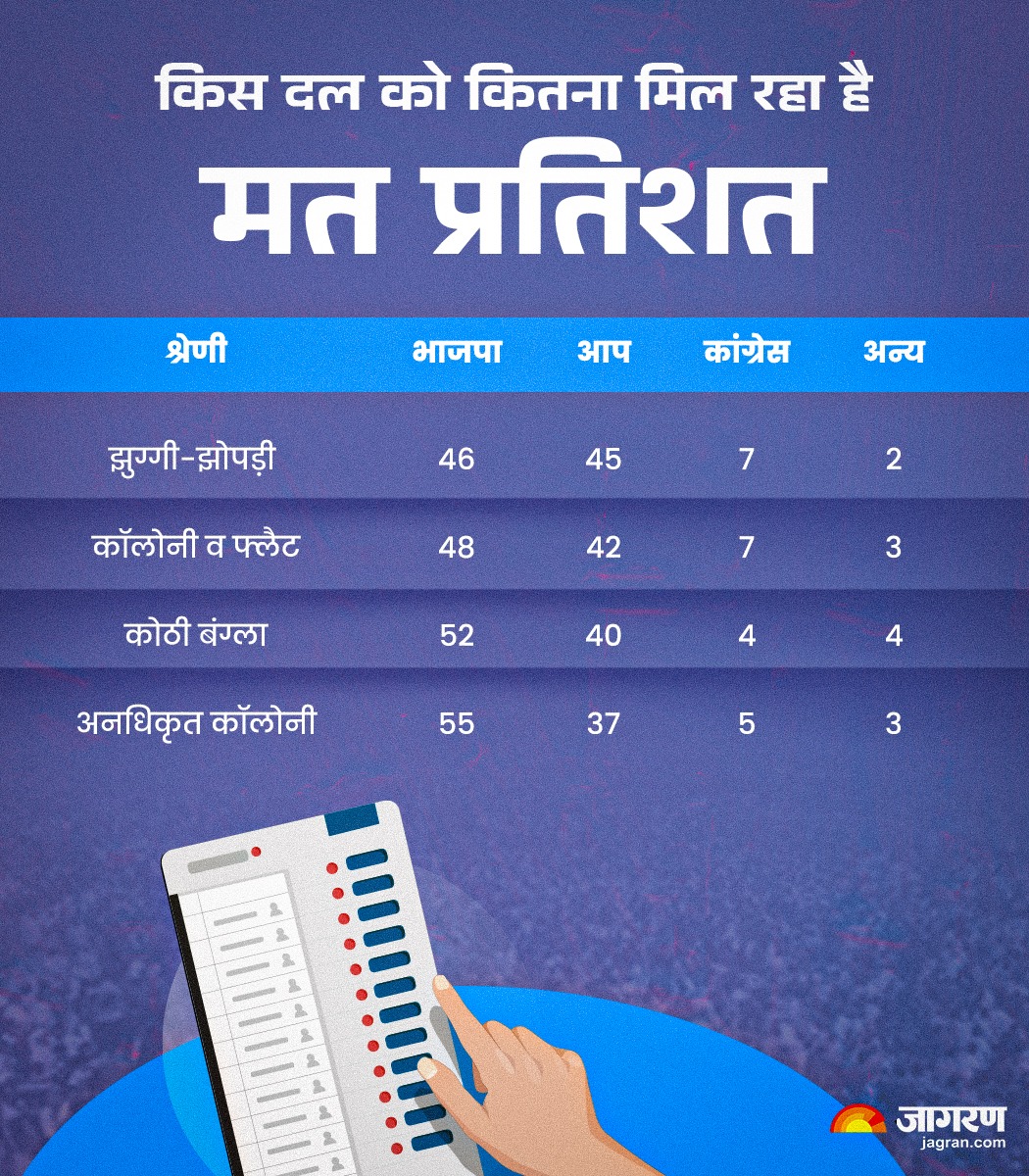 एक्सिस माय इंडिया के अनुसार, कॉलोनी और फ्लैट में रहने वाले 68 प्रतिशत मतदाताओं में से 48 प्रतिशत भाजपा के पक्ष में जबकि आप के पक्ष में 42 प्रतिशत मतदान हुआ है। प्रमुख एक्जिट पोल के अनुसार भाजपा को उत्तर-पूर्वी दिल्ली, पूर्वी दिल्ली, चांदनी चौक, बराड़ी, बादली, संगम विहार, पालम, करावलनगर और पटपड़गंज समेत उन सभी इलाकों में भाजपा की बढ़त दिखा रहे हैं, जहां कभी कांग्रेस और उसके बाद आप का वर्चस्व हुआ करता था।
