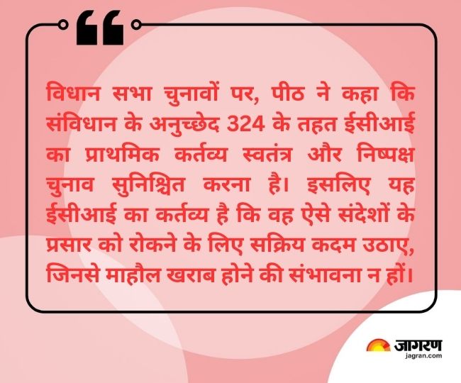 विधान सभा चुनावों पर, पीठ ने कहा कि संविधान के अनुच्छेद 324 के तहत ईसीआई का प्राथमिक कर्तव्य स्वतंत्र और निष्पक्ष चुनाव सुनिश्चित करना है। इसलिए यह ईसीआई का कर्तव्य है कि वह ऐसे संदेशों के प्रसार को रोकने के लिए सक्रिय कदम उठाए, जिनसे माहौल खराब होने की संभावना न हों।