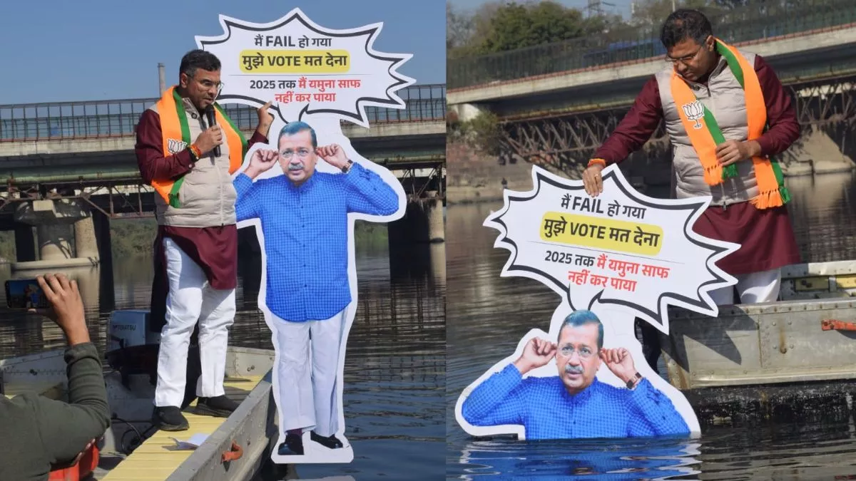 उस कटआउट में केजरीवाल कान पकड़े देखे जा सकते हैं। इसमें केजरीवाल की तस्वीर के साथ ही लिखा है, 'मैं फेल हो या, मुझे वोट मत देना... 2025 तक यमुना साफ नहीं कर पाया'।
