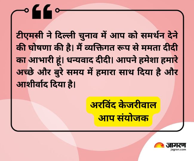 इस संबंध में आम आदमी पार्टी के राष्ट्रीय संयोजक और पूर्व मुख्यमंत्री अरविंद केजरीवाल (Arvind Kejriwal) ने एक्स पर पोस्ट कर पश्चिम बंगाल की मुख्यमंत्री ममता बनर्जी को शुक्रिया कहा है। उन्होंने पोस्ट कर लिखा, "टीएमसी ने दिल्ली चुनाव में आप को समर्थन देने की घोषणा की है। मैं व्यक्तिगत रूप से ममता दीदी का आभारी हूं। धन्यवाद दीदी। आपने हमेशा हमारे अच्छे और बुरे समय में हमारा साथ दिया है और आशीर्वाद दिया है।"