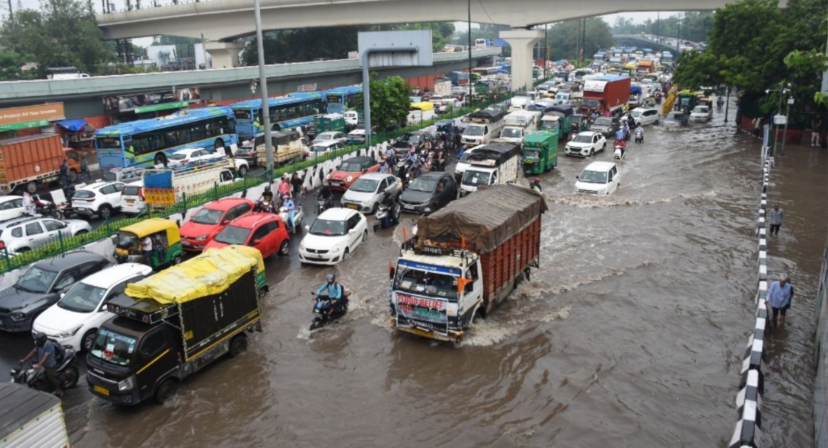 कश्मीरी गेट बस अडडे के समीप रिंग रोड पहुंचे पानी से हुए जलभराव में लगे जाम में रेंगते वाहन। फोटो- चंद्र प्रकाश मिश्र
