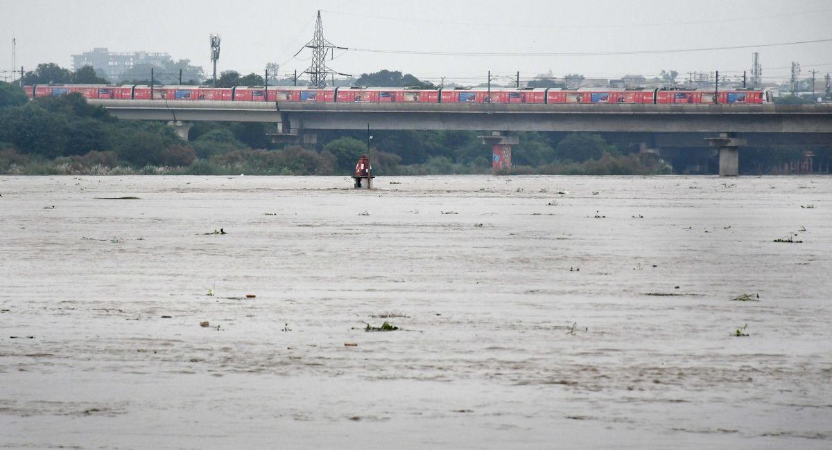 यमुना में बढ़े जलस्तर के बीच यमुना पुल से गुजतरी मेट्रो तथा बीच में जलमग्न हुआ बाबा बालक नाथ का मंदिर। फोटो- ध्रुव कुमार