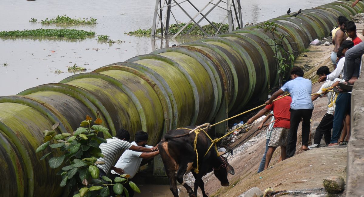 गामड़ी के पास यमुना किनारे खादर से पशु को बाहर निकालते लोग। फोटो- पारस कुमार