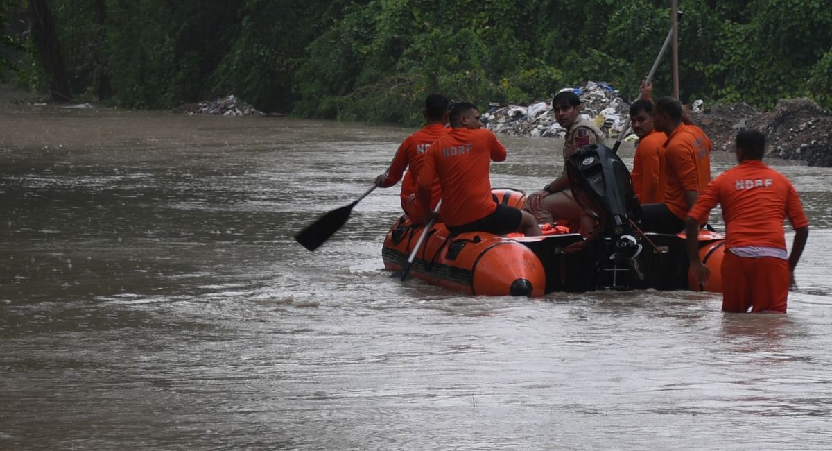 यमुना का जलस्तर बढ़ने पर नानकसर के नजदीक खादर में बचाव कार्य में लगी एनडीआरएफ की टीम। पारस कुमार