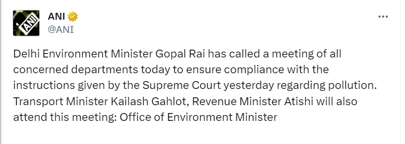 ताजा जानकारी के मुताबिक, दिल्ली के पर्यावरण मंत्री गोपाल राय (Gopal Rai) ने प्रदूषण को लेकर सुप्रीम कोर्ट द्वारा कल मंगलवार को दिए गए निर्देशों का अनुपालन सुनिश्चित करने के लिए आज बुधवार को सभी संबंधित विभागों की बैठक बुलाई है।