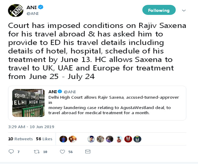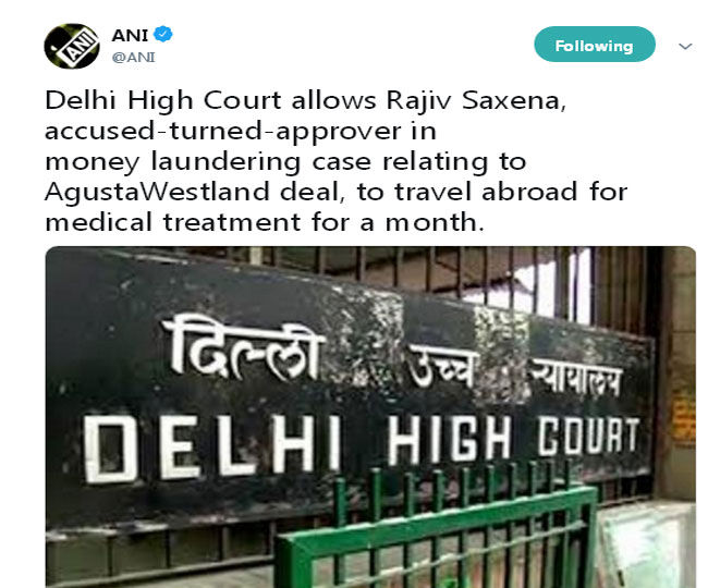 नई दिल्ली, जेएनएन। दिल्ली के हाई कोर्ट ने अगस्ता वेस्टलैंड वीवीआईपी हेलीकॉप्टर घोटाले मामले में आरोपित राजीव सक्सेना को विदेश जाने की अनुमति दे दी है। यह अनुमति उन्हें विदेश में जाकर इलाज करने के लिए मिली है।