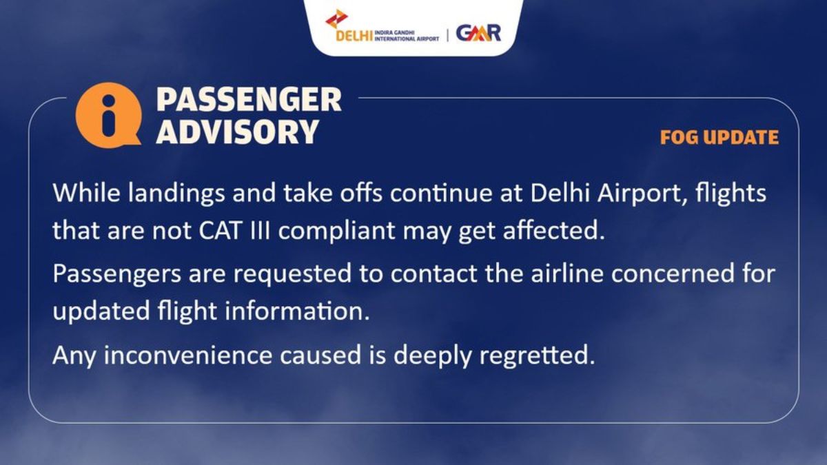 इसे लेकर दिल्ली एयरपोर्ट ने एडवाइजरी जारी की है। एडवाइजरी के अनुसार, जो उड़ानें CAT III के अनुरूप नहीं हैं, वे प्रभावित हो सकती हैं और यात्रियों से अनुरोध है कि वे उड़ान के संबंध में जानकारी के लिए एयरलाइन से संपर्क करें।