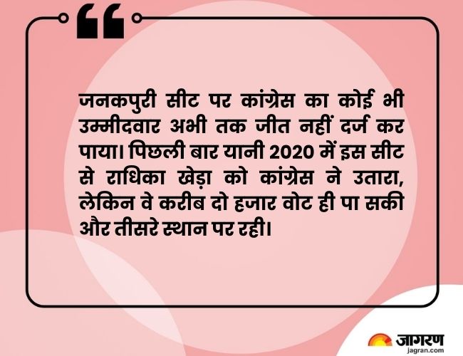 जनकपुरी सीट पर कांग्रेस का कोई भी उम्मीदवार अभी तक जीत नहीं दर्ज कर पाया। पिछली बार यानी 2020 में इस सीट से राधिका खेड़ा को कांग्रेस ने उतारा, लेकिन वे करीब दो हजार वोट ही पा सकी और तीसरे स्थान पर रही। वर्ष 2015 में इस सीट पर सुरेश कुमार को को उम्मीदवार बनाया गया। सुरेश प्रो जगदीश मुखी के दामाद हैं। लेकिन इस चुनाव में राजेश ऋषि ने प्रो जगदीश मुखी को सीधे मुकाबले में हराया। तीसरे स्थान पर सुरेश रहे। यानि राजेश ऋषि ने ससुर व दामाद दोनों को शिकस्त दी।