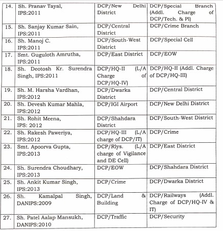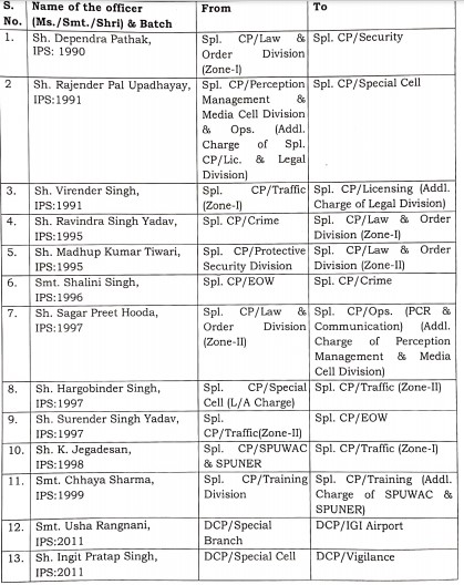 डीसीपी स्पेशल ब्रांच उषा रंगरानी को एयरपोर्ट, डीसीपी इंगित प्रताप सिंह को विजिलेंस, डीसीपी मध्य जिला संजय कुमार सेन को क्राइम ब्रांच, डीसीपी नई दिल्ली जिला प्रणय तायल को स्पेशल ब्रांच, टेक्नालोजी, डीसीपी दक्षिण-पश्चिम जिला मनोज सी को स्पेशल सेल, डीसीपी पूर्वी जिला गुगलोथ अमरूथा को आर्थिक अपराध शाखा भेजा गया है। डीसीपी मुख्यालय दो दियाेतोश कुमार सुरेंद्र को डीसीपी मुख्यालय तीन की अतिरिक्त जिम्मेदारी सौंपी गई है।