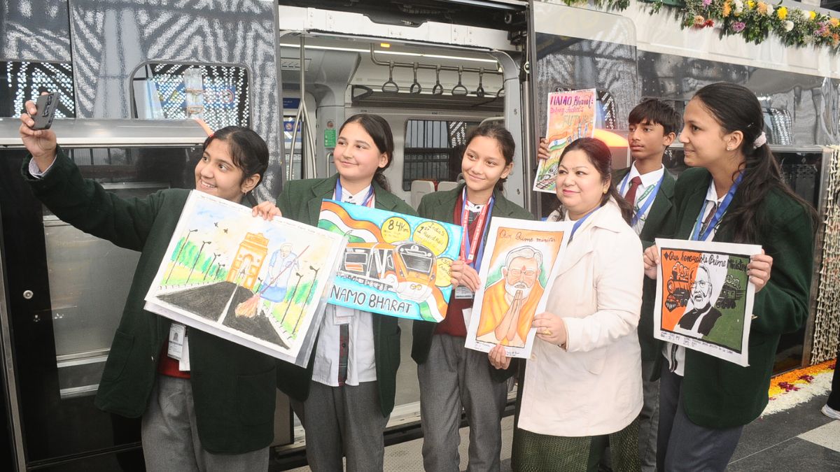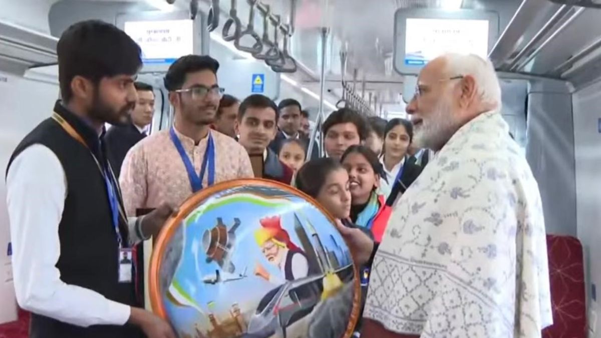 प्लेटफार्म पर खड़ी नमो भारत ट्रेन में प्रधानमंत्री सवार होकर न्यू अशोक नगर की ओर रवाना हो गए। ट्रेन के अंदर वह स्कूली बच्चों से रूबरू हुए। व्हीलचेयर पर बैठे दिव्यांग बच्चे ने उनको पेंटिंग दिखाई। एक बच्ची ने उनको कविता सुनाई।