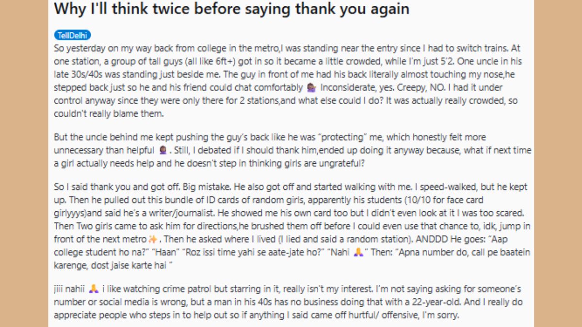 दिल्ली में एक 22 वर्षीय छात्रा ने मेट्रो में अपनी भयावह यात्रा का वर्णन रेडिट पर किया है। उसने बताया कि कैसे कुछ लड़कों ने उसे घेरा और एक अधेड़ व्यक्ति ने उसकी मदद की। धन्यवाद कहने पर उस व्यक्ति ने उसका पीछा किया बातचीत करने की कोशिश की और फोन नंबर मांगा। छात्रा ने मना कर दिया पर इस घटना ने लड़कियों की सुरक्षा पर सवाल खड़े कर दिए।