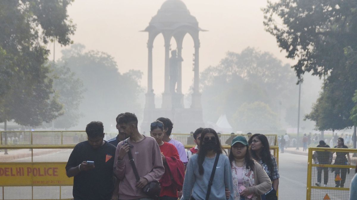 घने स्माग के बीच कर्तव्यपथ पर घूमते पर्यटक। फोटो- हरीश कुमार
