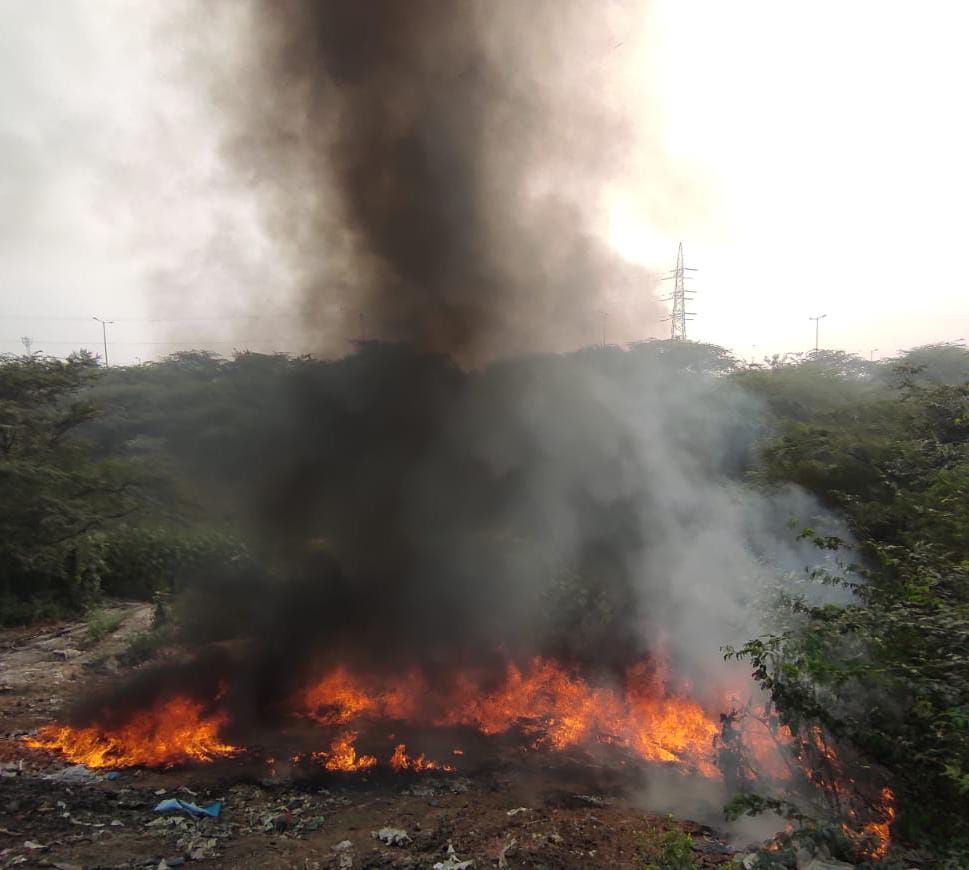 प्रदूषण के बावजूद लापरवाही: खजूरी वजीराबाद रोड के पास सड़क किनारे कूड़े में आग से उठता धुआं।