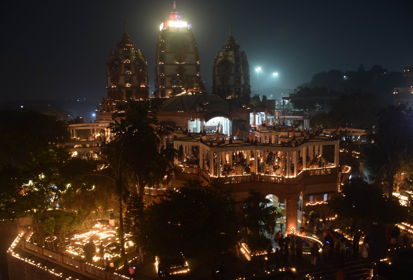 श्री राम प्राण प्रतिष्ठा के मौके पर दीपों से जगमगाता दिल्ली का इस्कॉन मंदिर।