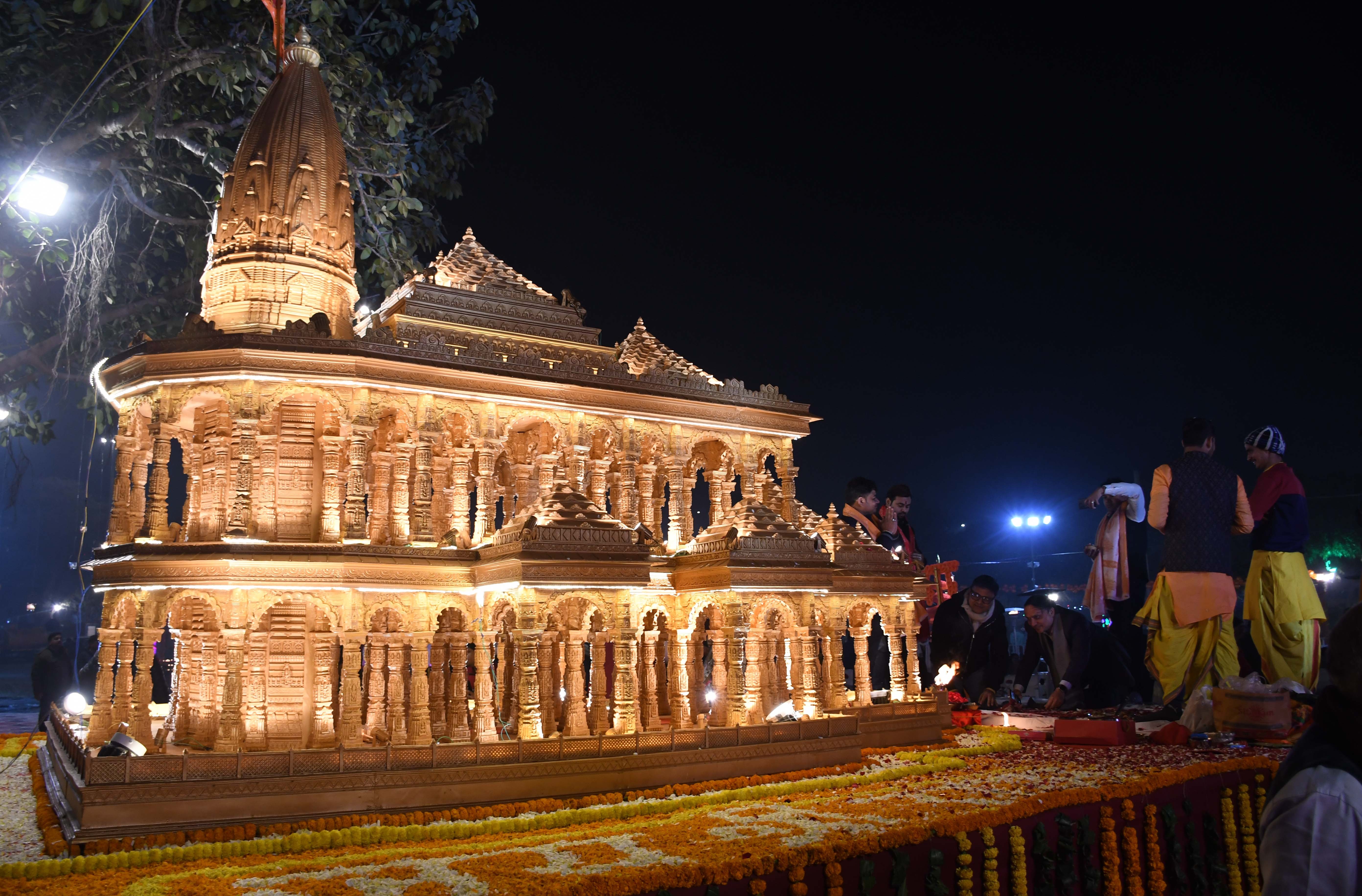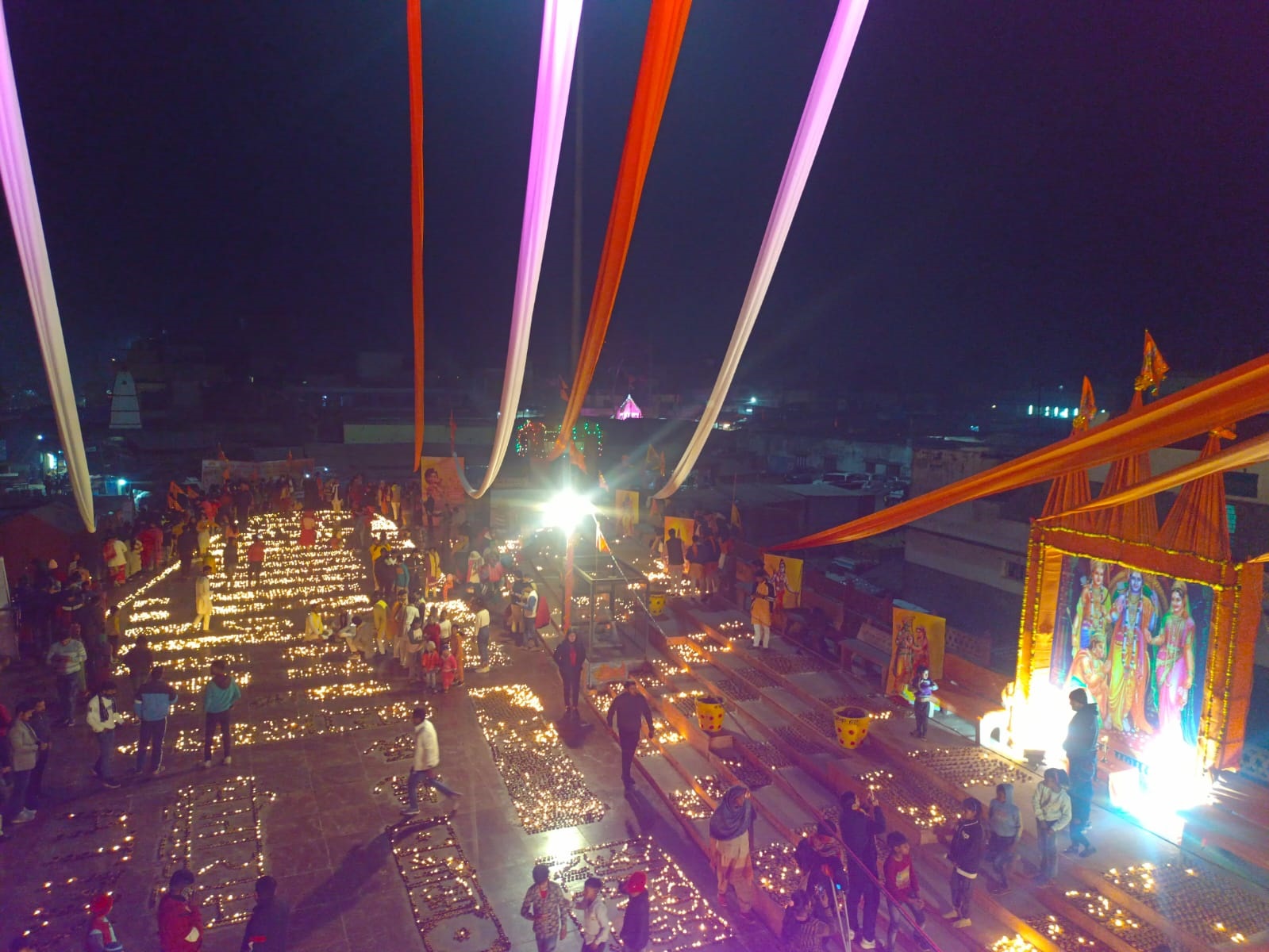 अयोध्या में रामलला के विग्रह की प्राण प्रतिष्ठा के बाद यमुना वासुदेव घाट पर दीपोत्सव के दौरान अयोध्या मंदिर की प्रतिकृति।