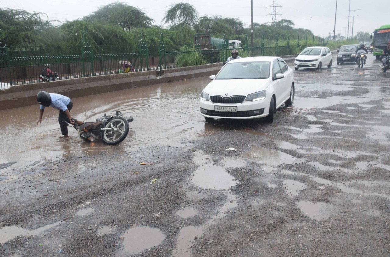 ओखला लैंडफिल साइट के सामने टूटी सड़क पर वर्षा के पानी भरे गड्ढों में फंसकर गिरा बाइकसवार।