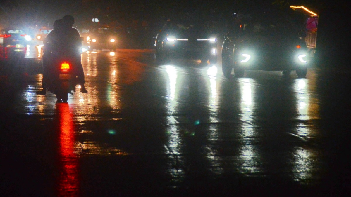 रोहिणी क्षेत्र में वर्षा के दौरान सड़क पर चमकती वाहनों की लाइटें।