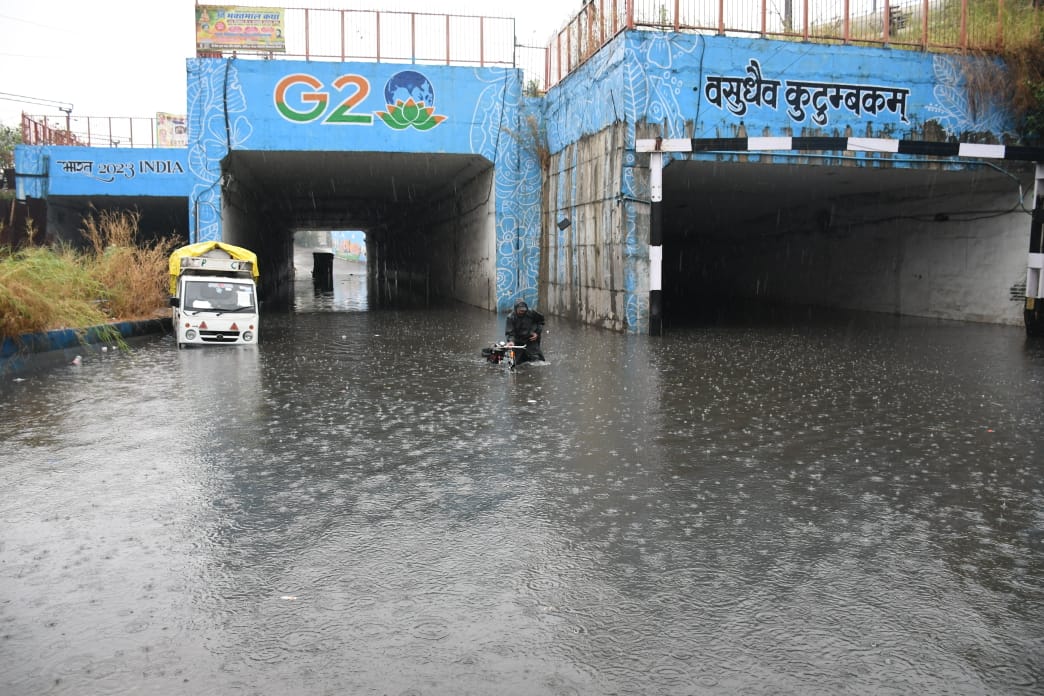 फरीदाबाद में वर्षा के बाद ग्रीनफील्ड रेलवे अंडरपास में हुए जलभराव में चालक सहित फंसी कार। पुलिस कर्मियों की मदद से कार को बाहर निकालने का प्रयास किया गया।