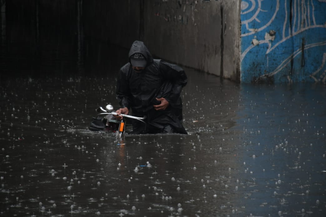 नोएडा के महामाया फ्लाईओवर के नीचे बने यू-टर्न में हुए जलभराव के बीच जाते वाहन।