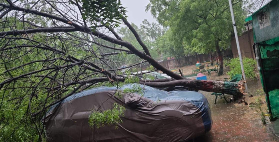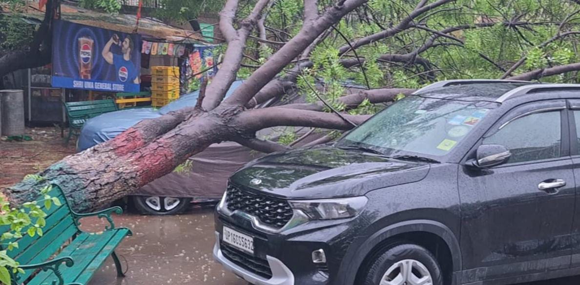 नोएडा सेक्टर-62 रजत विहार सी ब्लॉक सोसायटी में एक पेड़ गिर गया।