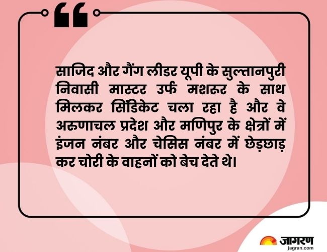 पूछताछ में उसने बताया कि वह अपने साले साजिद और गैंग लीडर यूपी के सुल्तानपुरी निवासी मास्टर उर्फ मशरूर के साथ मिलकर सिंडिकेट चला रहा है और वे अरुणाचल प्रदेश और मणिपुर के क्षेत्रों में इंजन नंबर और चेसिस नंबर में छेड़छाड़ कर चोरी के वाहनों को बेच देते थे।