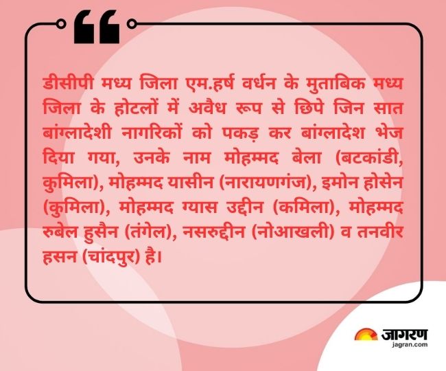 इस माह मध्य जिला पुलिस द्वारा अब तक 17 बांग्लादेशी नागरिकों को पकड़ कर उन्हें एफआरआरओ के जरिये बांग्लादेश भेज चुकी है। तकनीकी और मैन्युअल जानकारी के आधार पर भी जिला पुलिस होटलों आदि के सत्यापन में जुटी हुई है।