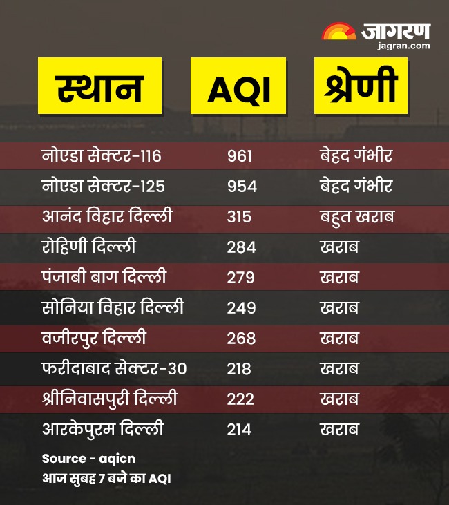 डिजिटल डेस्क, नई दिल्ली। दिल्ली-एसनीआर में आज यानी मंगलवार को एक्यूआई बेहद गंभीर श्रेणी में दर्ज किया गया। एक्यूआईसीएन (aqicn) के अनुसार, नोएडा-125 में आज सुबह करीब सात बजे का एक्यूआई 954 दर्ज किया गया। वहीं, नोएडा-116 का AQI 961 रहा और दिल्ली के आनंद विहार में भी बहुत खराब श्रेणी में दर्ज किया गया।